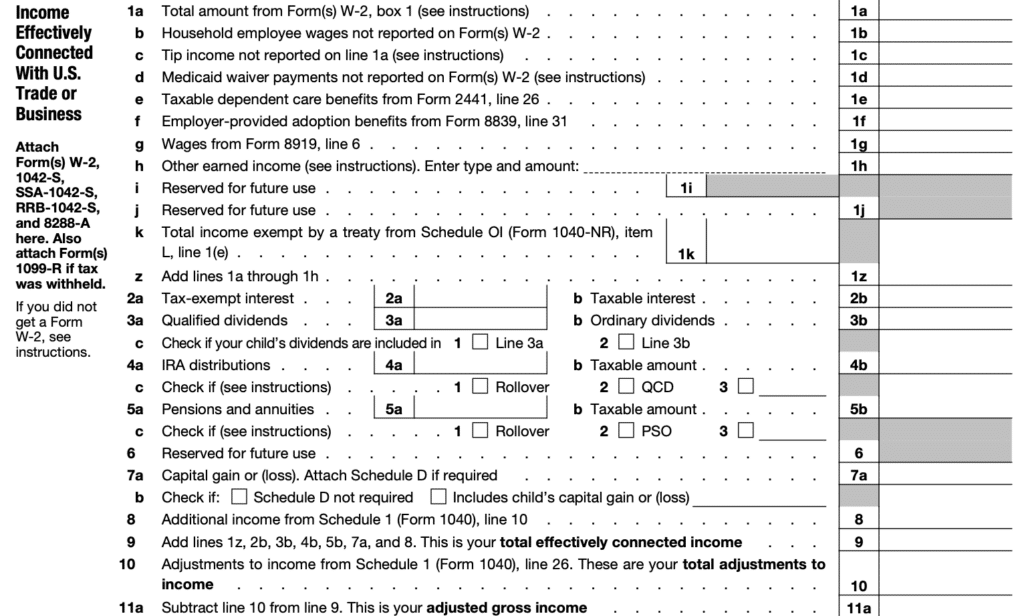 Effectively connected income for Form 1040-NR (Page 1, lines 1-11a)
